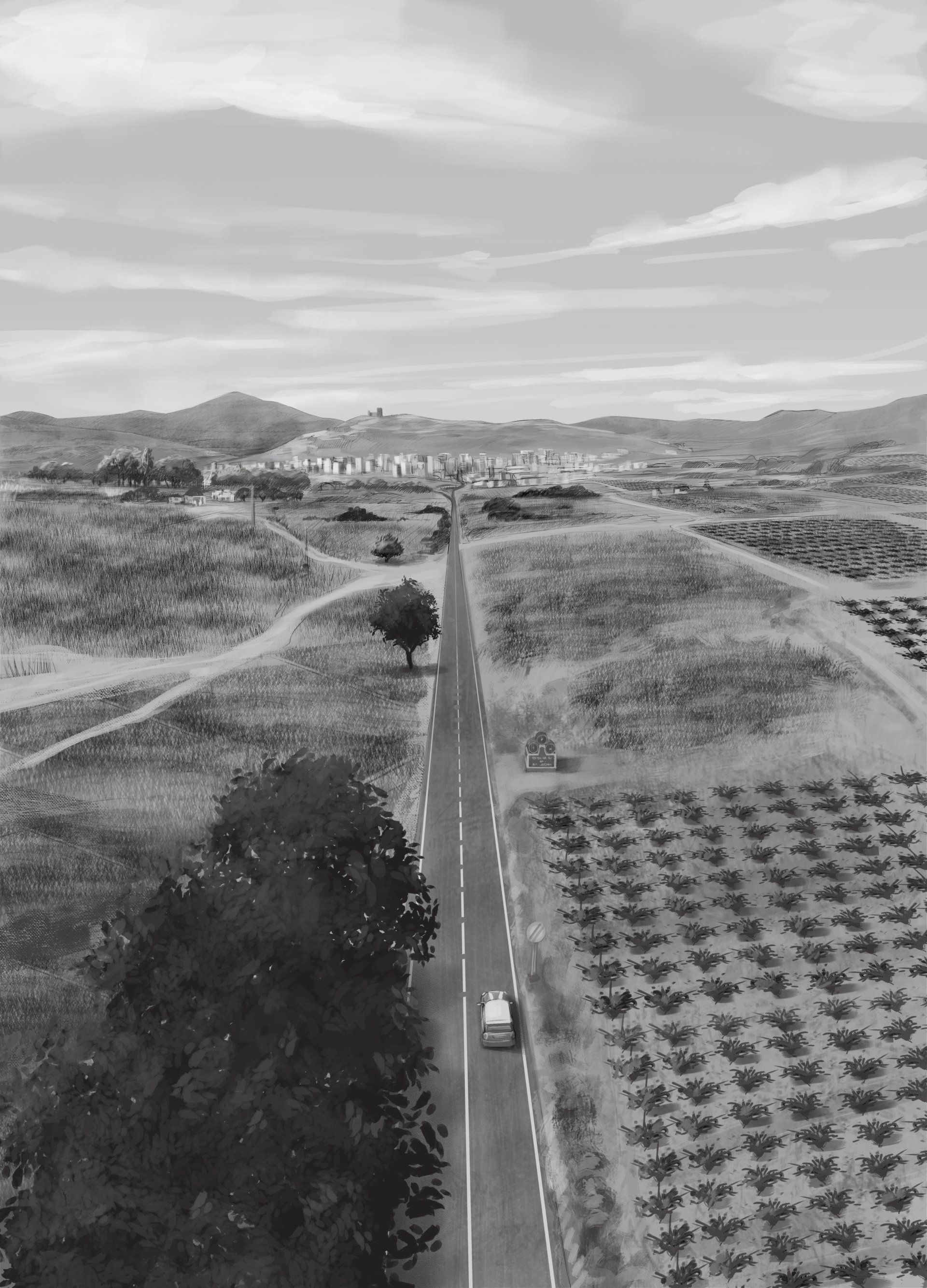 Maravillosa escena que refleja la entrada al pueblo de Jumilla desde la carretera de Murcia, siendo tres elementos los que de este modo la identifican: los enormes árboles a la izquierda, pegados a la carretera; el muro decorado con toneles a la derecha, anunciando las fechas de las fiestas de Feria y Vendimia; y la silueta del castillo a lo lejos, en lo alto de la montaña frontal, por encima de todas las casas y edificios del pueblo. Magnífico reflejo del lugar que tanto estimo y amo.