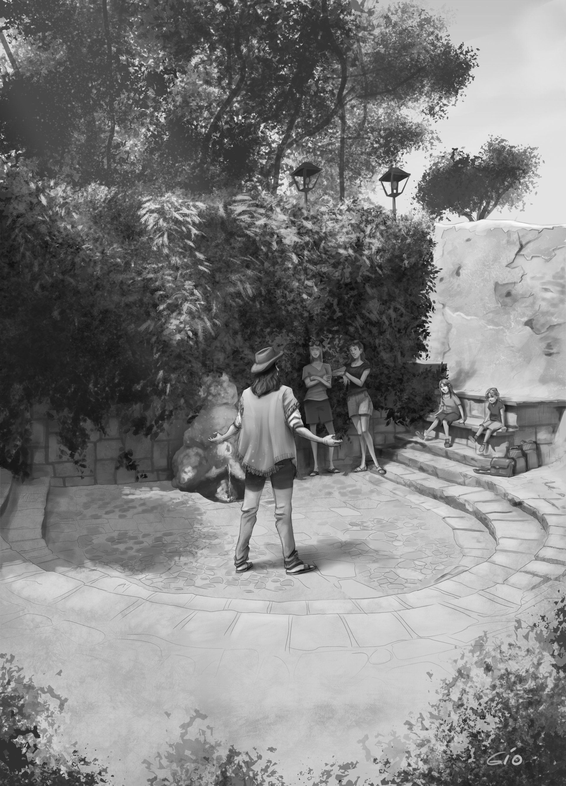 Este lugar supone uno de los tantos escenarios emblemáticos y culturales del pueblo de Jumilla. En el dibujo se aprecia una muchedumbre disfrutando de unos vinos y del buen clima primaveral en una maravillosa mañana de sábado donde tiene lugar una feria del vino. Los stands y casetas montadas amenizan la fiesta mientras que las protagonistas se quedan asombradas por tan maravilloso evento. La sorpresa es mayúscula para ellas porque precisamente es lo que venían buscando a este pueblo: turismo enológico y diversión, a la vez que paz y entretenimiento.